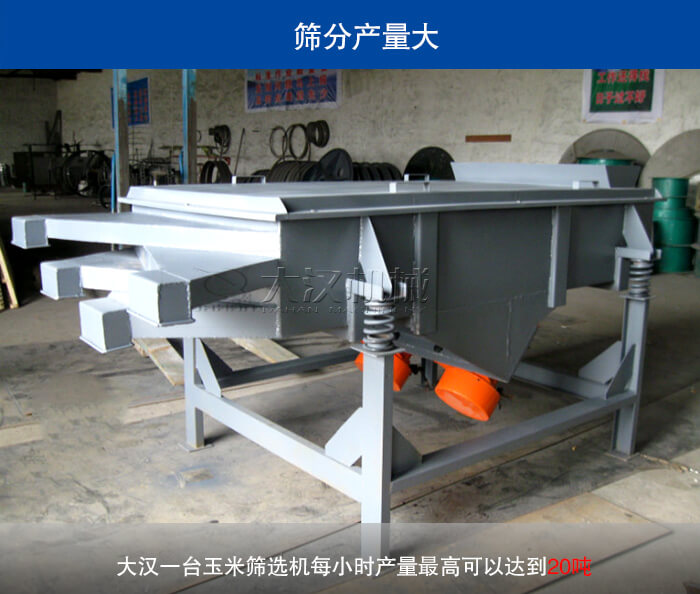 針對玉米篩選行業(yè)而言,對我們篩選機(jī)的產(chǎn)量是有要求的,大漢生產(chǎn)的玉米篩選機(jī)采用雙電機(jī)驅(qū)動,設(shè)備激振力大,而且我們的玉米篩選機(jī)加裝分料器,能有效的利用直線振動篩篩面面積,能使物料均勻分布在篩面上,大大提升物料篩分精度與蟬聯(lián),據(jù)實(shí)驗(yàn)證明,大漢一臺玉米篩選機(jī)每小時產(chǎn)量高可以達(dá)到20噸。