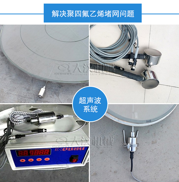 聚四氟乙烯在篩分時由于其物料性質所以會容易出現堵網問題,超聲波旋振篩獨特的超聲波系統可以將可以將220V、50Hz或110V、60Hz電能轉化為18KHz的高頻電能,輸入超聲換能器,將其變成18KHz機械振動,加快物料的分離,減少篩上物,可以解決聚四氟乙烯堵網問題。