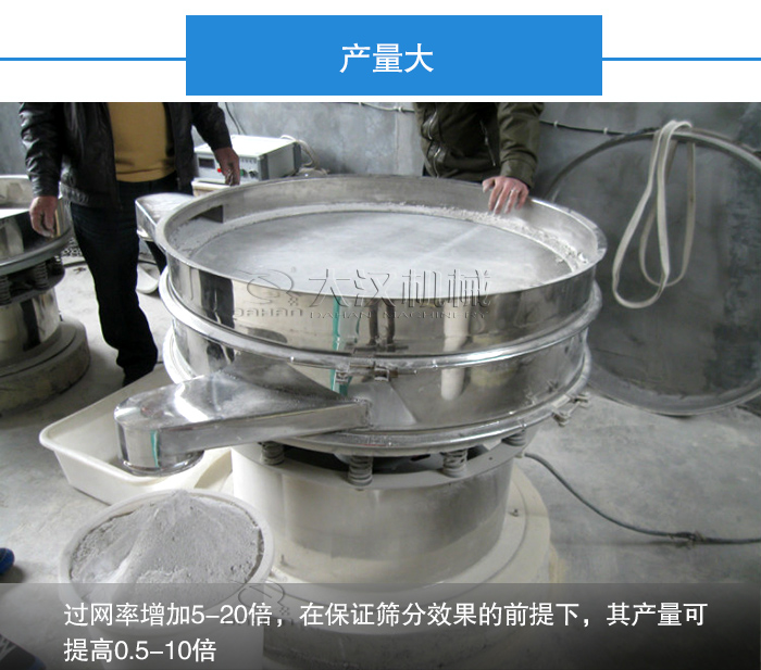 由于超聲波篩分系統的設計,我們的設備比不安裝超聲波的振動篩過網率增加5-20倍,在保證篩分效果的前提下,其產量可提高0.5-10倍。