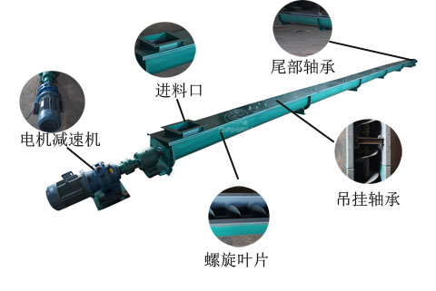U型螺旋輸送機工作時,電機帶動旋轉的螺旋葉片將物料推移而進行輸送,螺旋輸送機旋轉軸上焊的螺旋葉片,葉片的面型根據輸送物料的不同有實體面型、帶式面型、葉片面型等型式。使物料不與螺旋輸送機葉片一起旋轉的力是物料自身重量和螺旋輸送機機殼對物料的摩擦阻力。