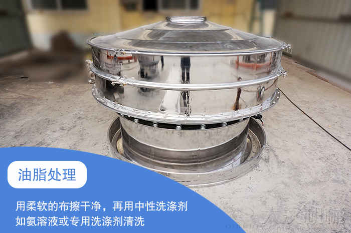 不銹鋼振動篩表面的油脂、潤滑油等污染,先用柔軟的布擦干凈,然后再用中性洗滌劑如氨溶液或專用洗滌劑清洗。