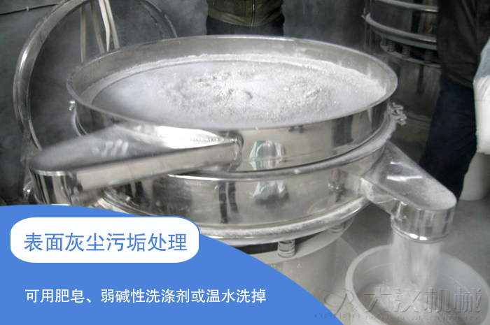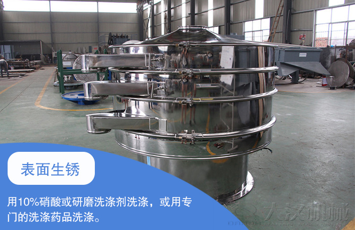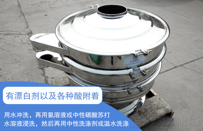 不銹鋼振動篩表面有漂白劑以及各種酸附著,立即用水沖洗,再用氨溶液或中性碳酸蘇打水溶液浸洗,然后再用中性洗滌劑或溫水洗滌。
