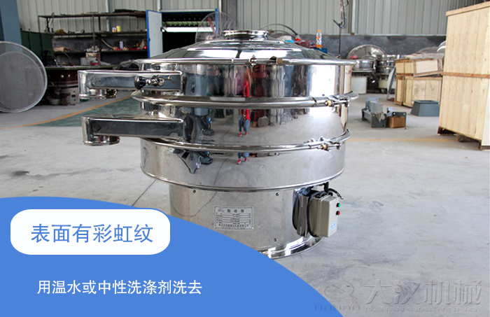 不銹鋼振動篩表面有彩虹紋,是過多使用洗滌劑或油引起,洗滌時用溫水或中性洗滌劑洗去。